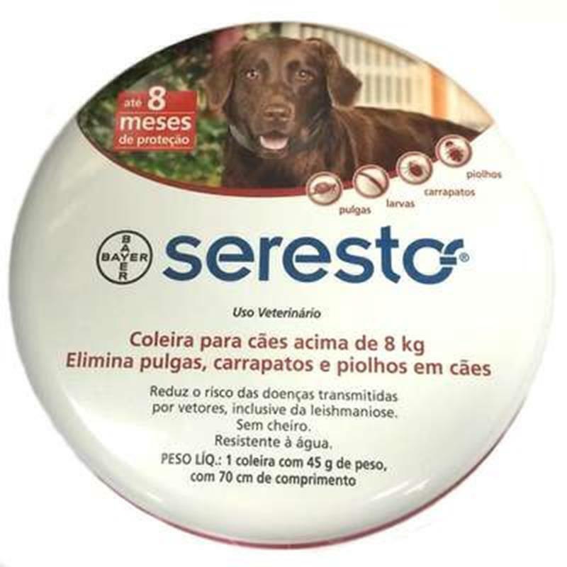 A Coleira Seresto é uma coleira antipulgas e carrapatos para cães acima de 8kg. Contém durabilidade de 8 meses. Proporciona efeito total em até 48 horas. Não tem cheiro e é resistente a água. Não colocar em filhotes de gato com menos de 10 semana e em filhotes de cão com menos de 7 semanas. Não colocar em caso de hipersensibilidade da pele. Não recomendado para fêmes em gestação ou lactação.